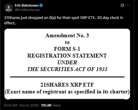 XRP jumped about 5% to $2.32 after 21Shares dropped Amendment No. 3 to its Form S-1 for a spot XRP ETF, and yeah, the market noticed fast. The filing was made under Section 8(a) of the Securities Act of 1933, which basically means a 20-day review clock starts ticking the moment it hits the SEC’s desk. If the SEC doesn’t step in with a delay, comment, or stop order during that period, the ETF can technically go effective automatically. ETF analyst Eric Balchunas flagged the move on X, while trader Scott Melker pointed out that this setup could put a potential go-live date somewhere around November 27 if regulators stay quiet.