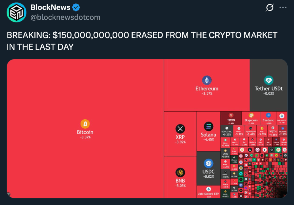The crypto market just got smashed again — another brutal red day that erased roughly $150 billion in total market value within 24 hours. Bitcoin, Ethereum, and most top altcoins all plunged as traders scrambled to exit positions. This wasn’t one single headline moment; it was a messy cocktail of leverage, fear, and fragile structure all detonating at once.