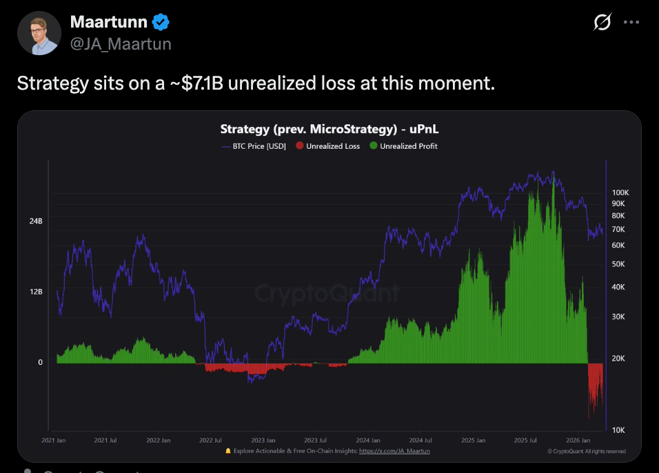 A ~$7.1 billion unrealized loss sounds dramatic, maybe even alarming at first glance. But the key detail is often skipped over, it’s not realized. No Bitcoin has been sold, no losses have been locked in, and the position itself hasn’t fundamentally changed, at least not yet.