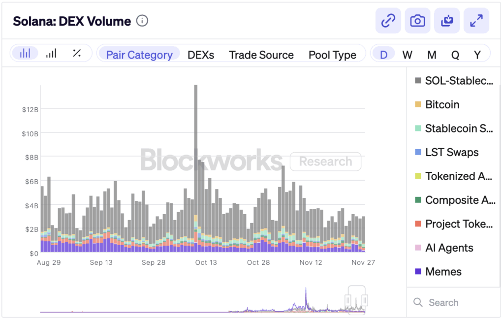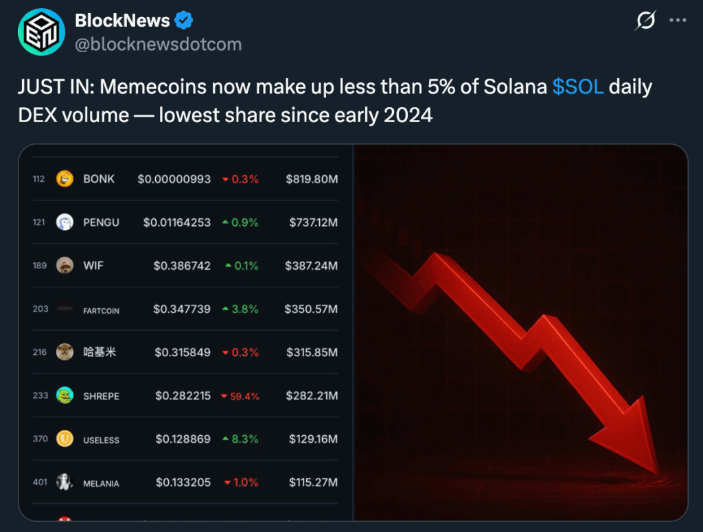 - Memecoin share on Solana DEXs has fallen from ~35% to under 9% while total volume remains strong.