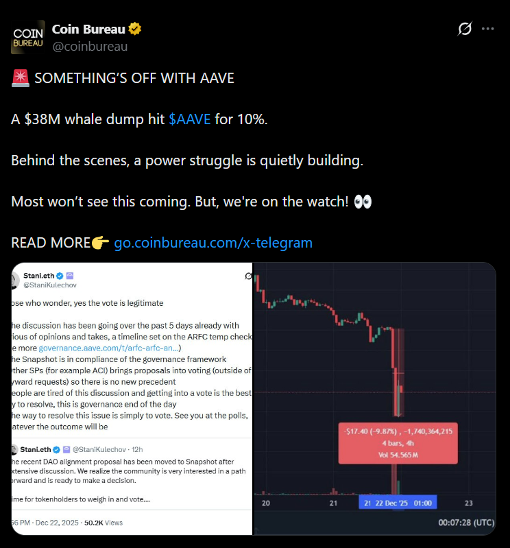 Aave is facing a rough stretch as internal governance tensions collide with a broader market downturn. The token recently suffered a sharp selloff after a whale offloaded roughly $38 million worth of AAVE, triggering a sudden 10% drop, according to Coin Bureau. While prices have clawed back slightly since then, the damage is still visible across higher timeframes.