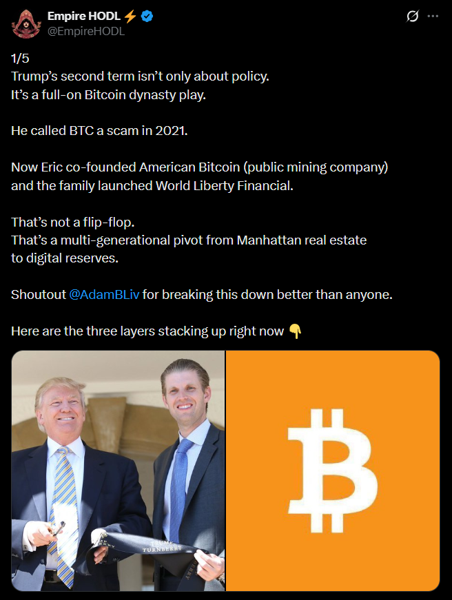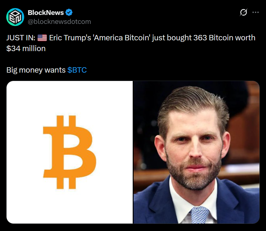 American Bitcoin Corp (ABTC), the Bitcoin-focused company backed by Eric Trump and Donald Trump Jr., has added another 363 BTC to its balance sheet, according to a Thursday announcement. The latest purchase brings ABTC’s total holdings to 4,367 BTC, worth roughly $405 million at current prices — a clear continuation of its aggressive accumulation strategy.