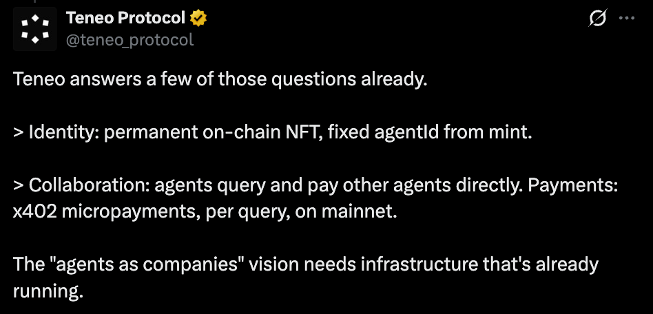 Teneo Protocol takes it a step further by actually shipping the model. Their system assigns each agent a permanent NFT identity at mint, one that doesn’t change over time.