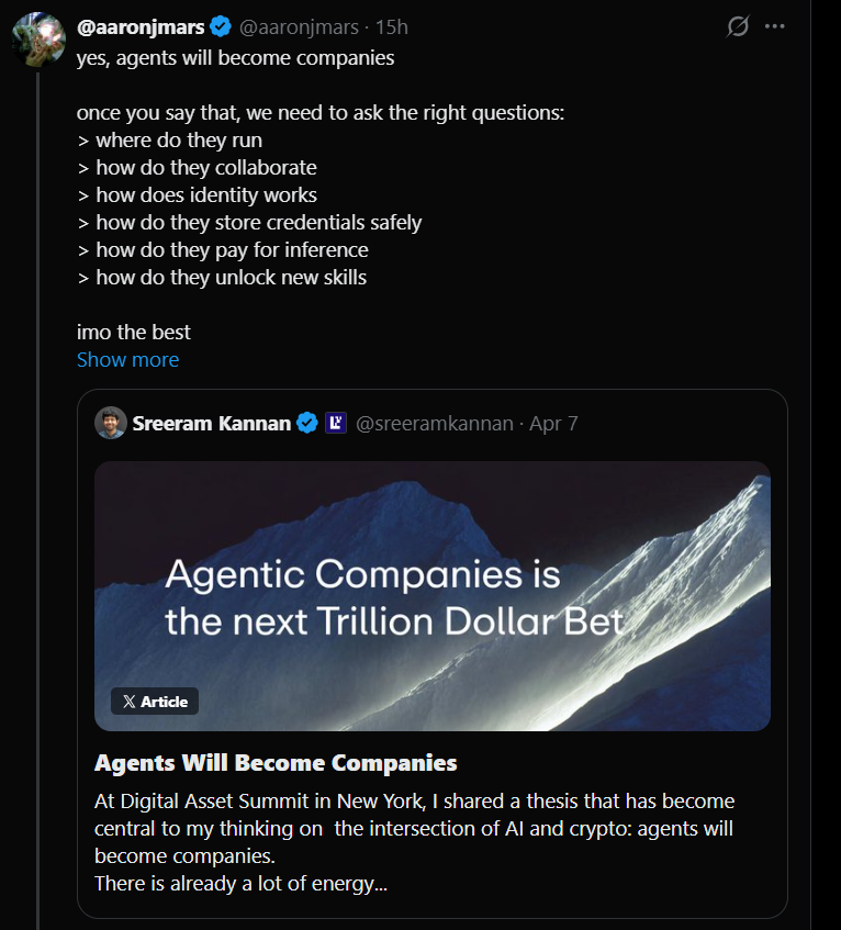 Sreeram Kannan’s thesis is pretty straightforward, AI makes agents intelligent, crypto makes them economic. Combine the two, and you don’t just get better software, you get something closer to autonomous entities.