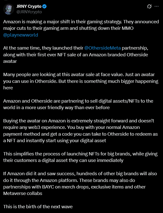 The last NFT cycle proved that collectible ownership has legs but onboarding and utility were messy. We saw soft attempts at credit-card NFT sales from Reddit, Nike, and Starbucks. Useful experiments, yes, but they lived in walled programs with uneven follow-through. Amazon plus Otherside changes the distribution and the day-one use case at the same time. If the first sale works at Amazon’s scale and the item does something the same day inside a live world, that is a consumer product, not a niche drop.