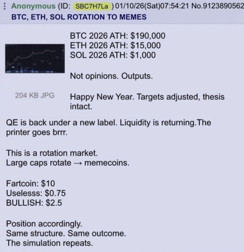 - An anonymous 4chan forecast suggests Bitcoin could peak near $190,000 in 2026, reigniting market speculation