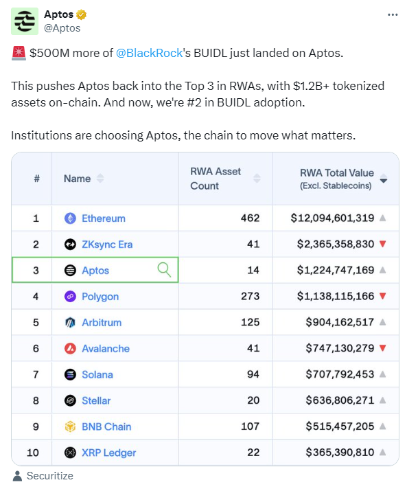 BlackRock’s BUIDL Fund has officially expanded to Aptos, adding $500 million in tokenized assets to the chain. This makes Aptos the second-largest blockchain for BUIDL deployment, right behind Ethereum. The total tokenized asset value on Aptos has now crossed $1.2 billion — ranking it third globally in the tokenized real-world asset (RWA) race.