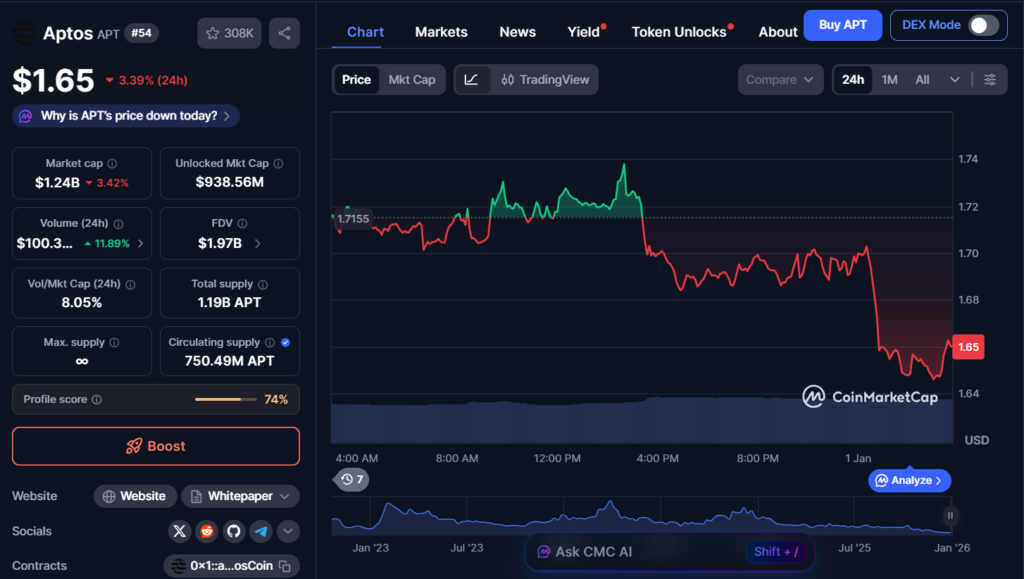 The most notable activity occurred earlier in the session, when APT saw a sudden spike of 12.2 million tokens traded, more than double its 24-hour moving average. That burst of volume coincided with a sharp rejection near $1.75, firmly establishing the zone as major resistance.