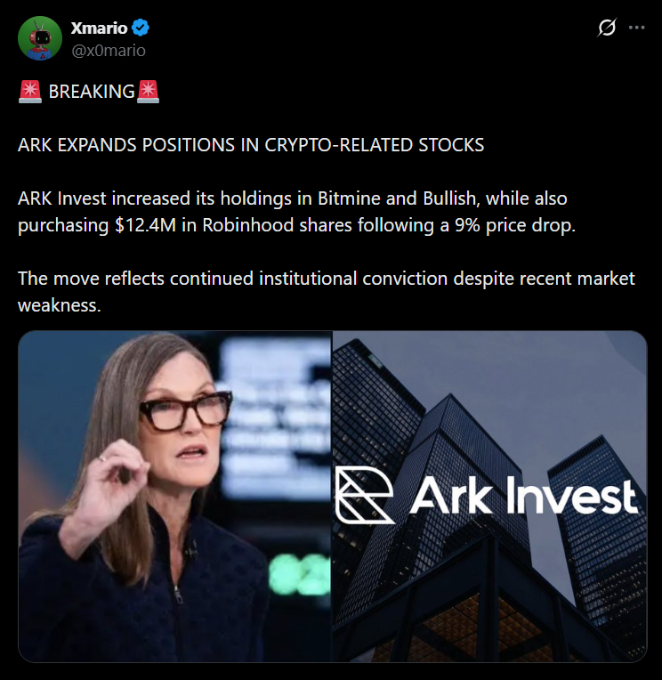 - ARK added to Bitmine, Bullish, and Robinhood in fresh crypto equity buys