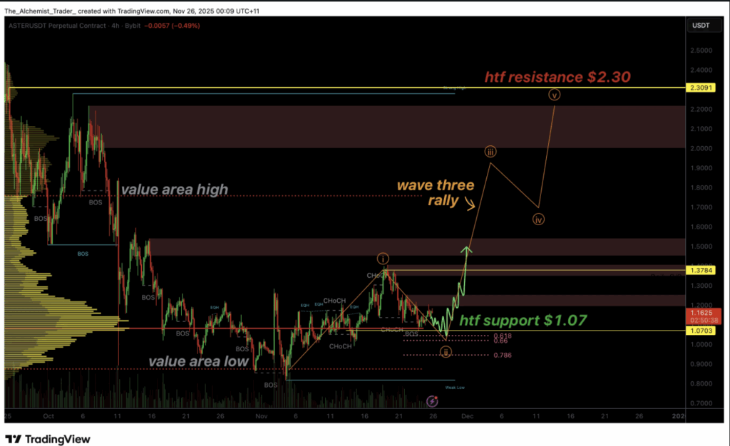 For the Elliott Wave pattern to stay valid, Aster now needs to form a higher low right inside this support range. If it does, that would confirm the Wave 2 retracement and open the door for a Wave 3 expansion — typically the strongest, most impulsive leg of the entire cycle. A Wave 3 move for Aster would target the value-area high first before stretching toward the key $2.30 resistance. That level has stopped several rallies in the past and would likely become the first big battleground if momentum accelerates.
