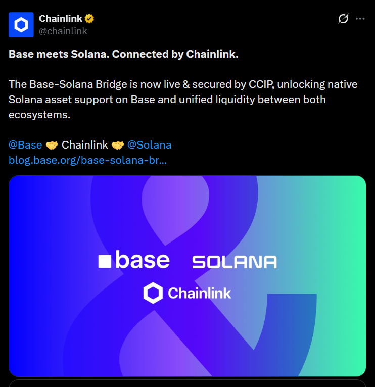 - Base and Solana now share a live cross-chain bridge secured by Chainlink CCIP and Coinbase.
