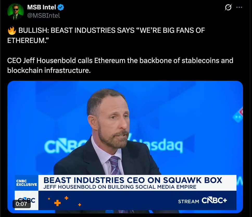 Every so often, a corporate executive goes beyond vague crypto optimism and names a specific network as essential infrastructure. That’s what Beast Industries CEO Jeff Housenbold did when he described Ethereum as the backbone of stablecoins and blockchain. It wasn’t a passing comment either, it was a direct acknowledgment of ETH’s role in powering real financial systems.