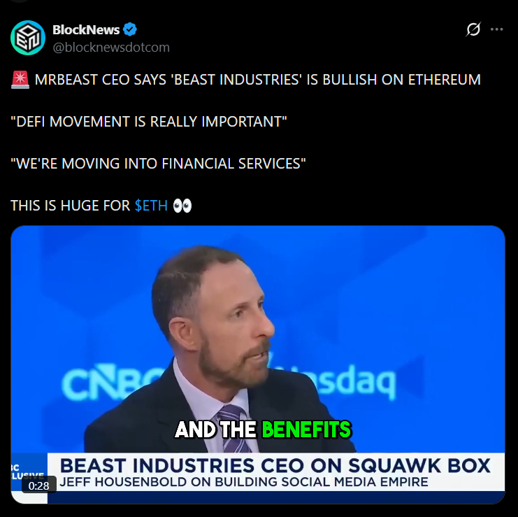 Beast Industries Goes All-In on Ethereum Calling It the Backbone of Stablecoin and Blockchain Infrastructure