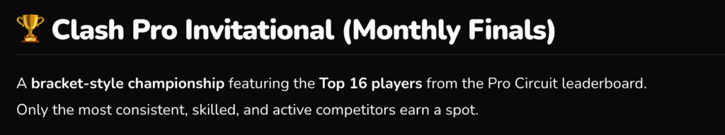 Designed for Semi-Pro and Pro players, the Pro Circuit offers tougher weekly matches and a path into the monthly Clash Pro Invitational. Anyone can opt in if they want the higher challenge, but Pro Circuit players cannot enter the Normal Circuit.