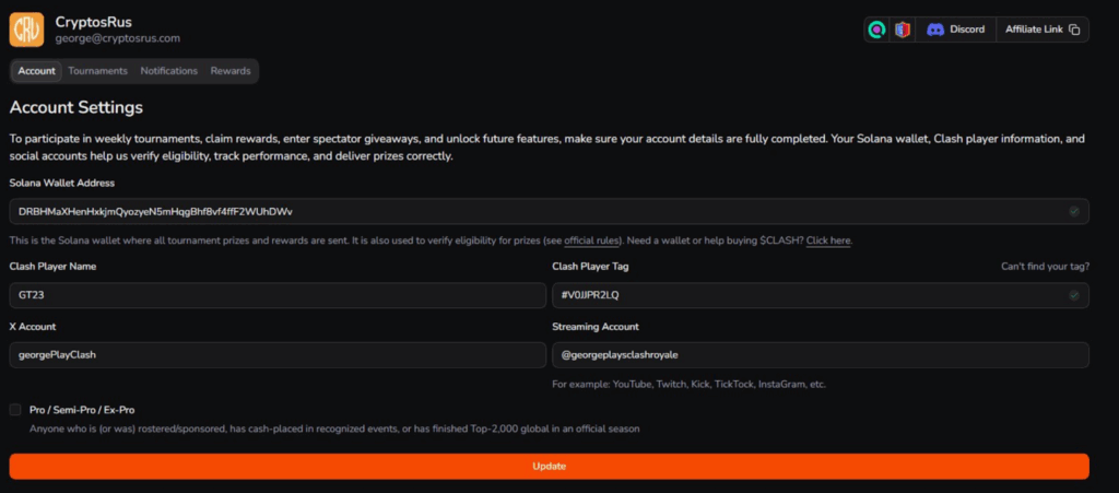 The latest account overhaul finally lets players save all their info permanently. Once someone signs up, their details stay stored so they can jump into future tournaments without doing the setup process again. The dashboard now shows previous placements, past prizes, and giveaway wins, all in one place. A new rewards section has also been introduced to support loyalty bonuses and referrals. Every account now includes an affiliate link, giving players a simple way to bring new competitors into the tournaments and earn extra perks.