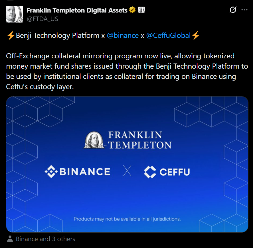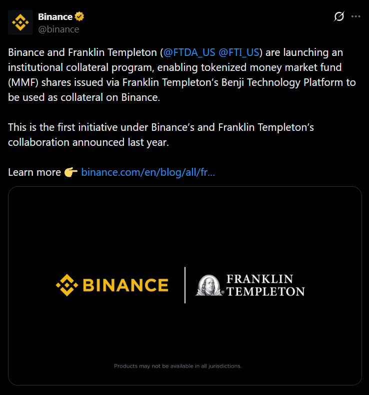 Binance and asset manager Franklin Templeton have officially launched their first joint product targeting institutional investors. The partnership, in development since September 2025, introduces an off-exchange collateral framework that allows institutions to use tokenized money market fund shares as trading collateral on Binance.