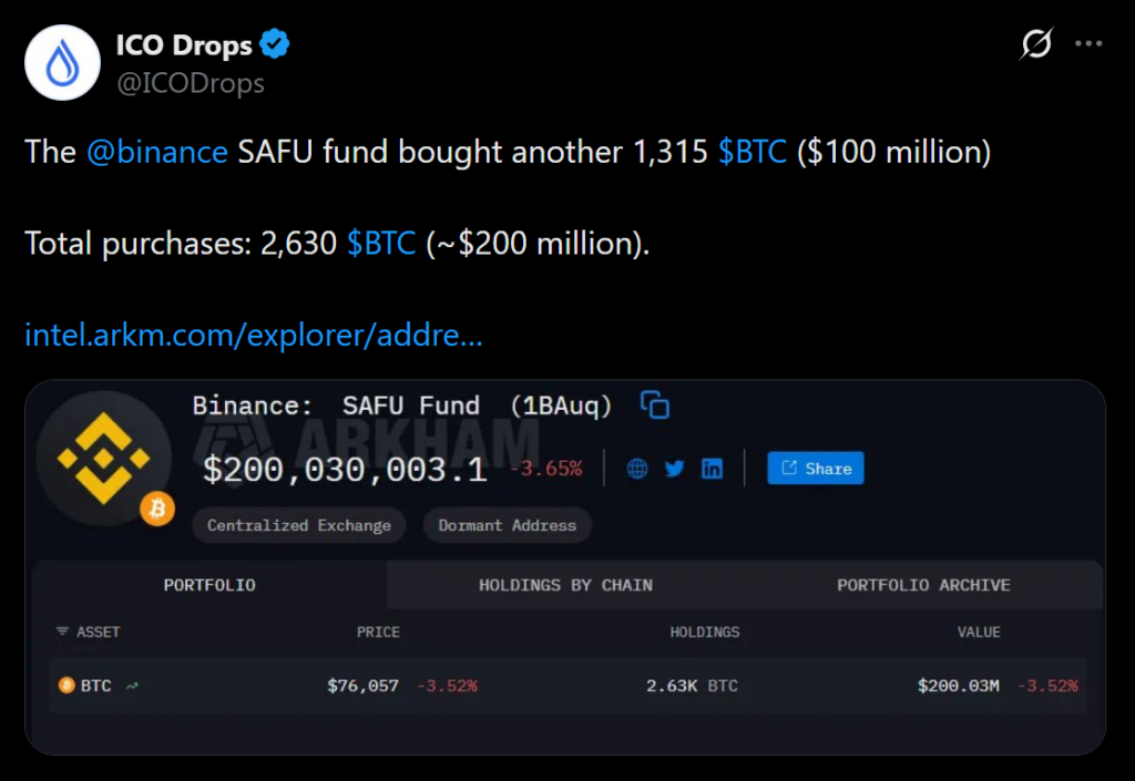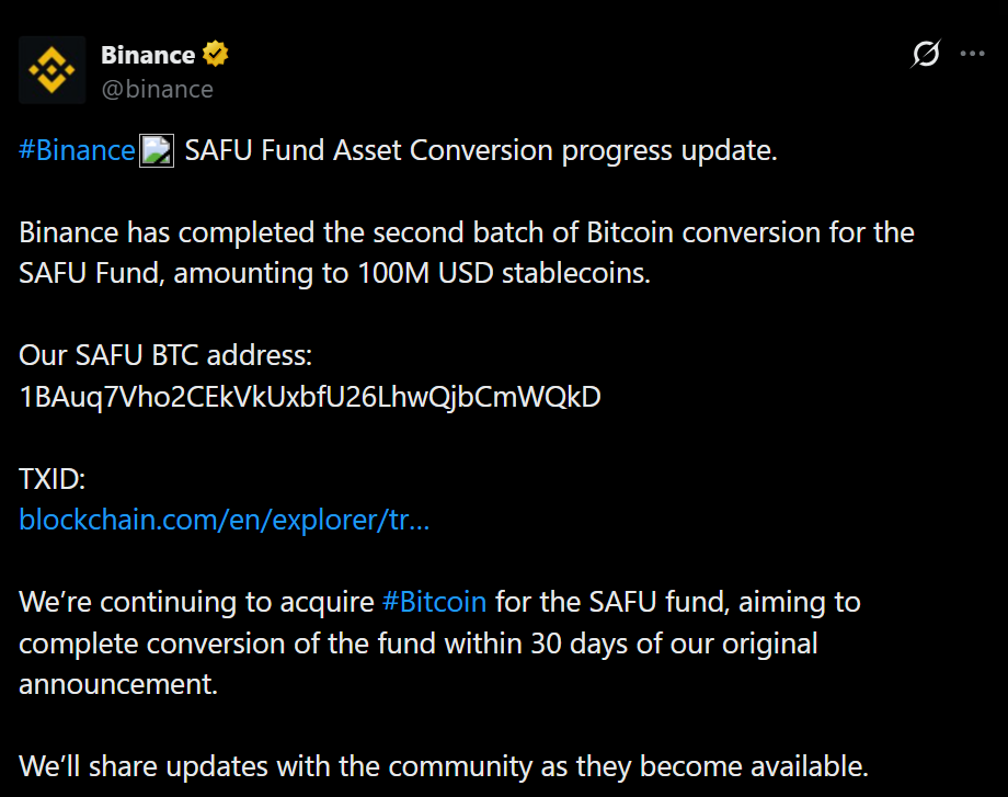 Binance has completed the second phase of its Bitcoin conversion for the Secure Asset Fund for Users, adding another $100 million worth of BTC to the reserve. The exchange confirmed the transaction publicly through its official X account, sharing both the wallet address and transaction ID to allow on-chain verification. That transparency signals this isn’t a symbolic move, it’s an operational one.