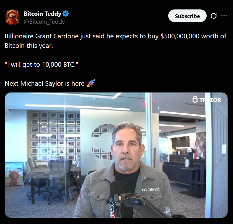 • Grant Cardone plans to buy $500M in Bitcoin this year
