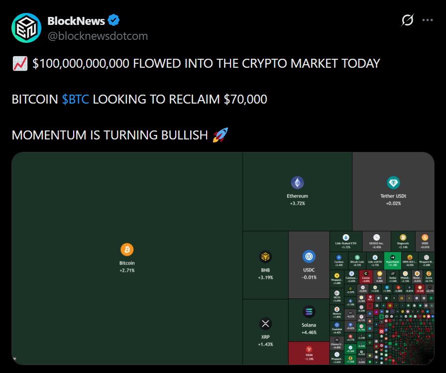 While the short-term move looks bullish, the broader chart structure still leaves some important questions unanswered. Bitcoin opened the session around $65,974 before climbing toward an intraday high near $69,500. That nearly 5% surge provided momentum for day traders, but the longer-term technical structure still shows resistance ahead.