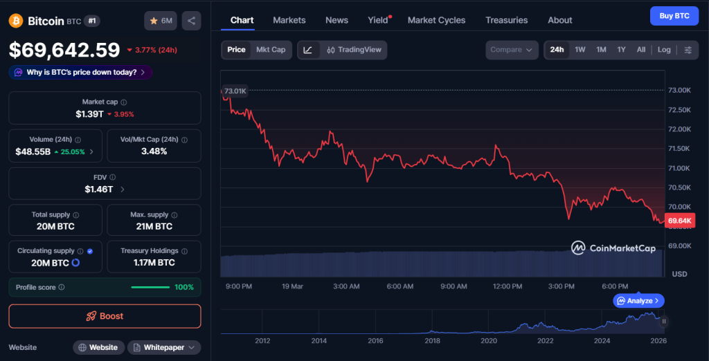Bitcoin is feeling the pressure again, slipping to around $69,600 as broader macro forces start to weigh on crypto markets. The drop, modest on paper, comes as energy prices surge sharply, with Brent crude climbing to $114 and Oman crude reportedly pushing toward $150. That kind of move tends to ripple through global markets, and crypto, despite its independence narrative, still reacts to these shocks more than some expect.