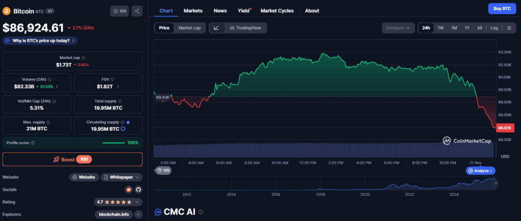 The timing and severity of the crash show how fragile the crypto market remains during the broader correction phase. Bitcoin’s quick move under $87,500 highlights the lack of strong buy-side support, while ongoing macro uncertainty and fading risk appetite have amplified every downside move.