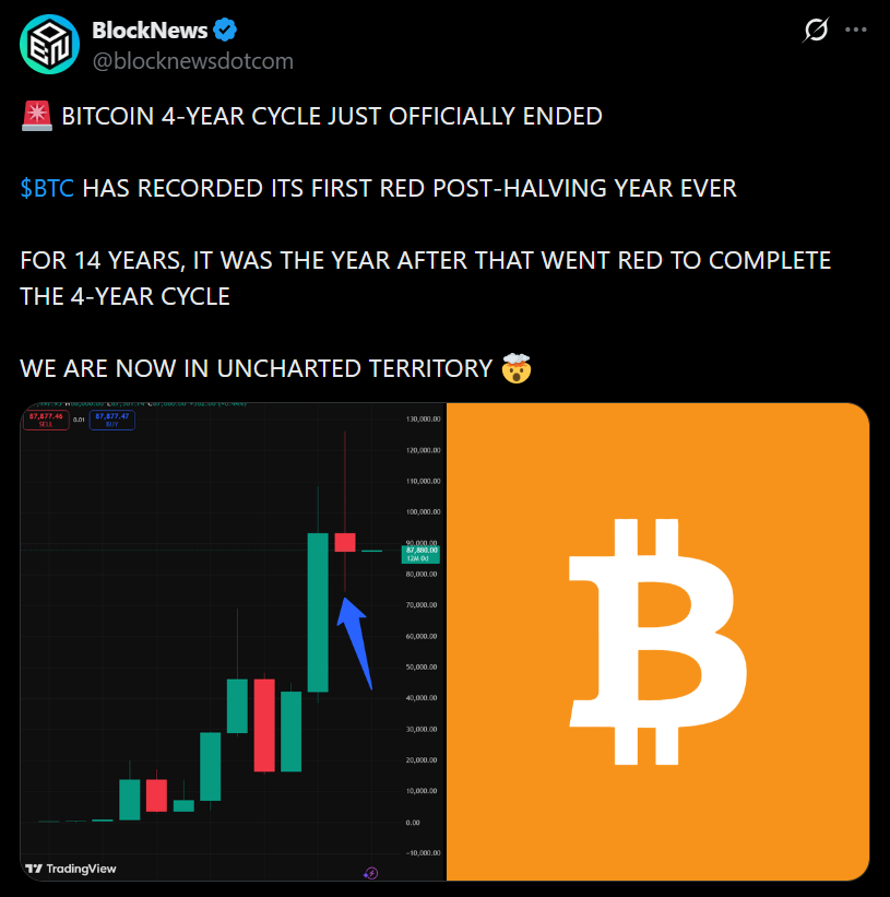 Bitcoin closed 2025 with a distinction it has never carried before. For the first time since halvings became a defining feature of its market structure, BTC finished a post-halving year with a negative annual return. The result has forced investors to rethink long-held assumptions about how Bitcoin moves, and whether the famous four-year cycle still works the way it used to.