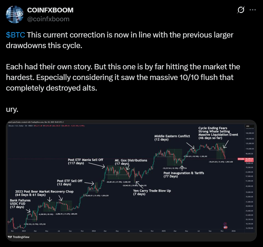 According to market analysts such as Alex Kuptsikevich, conditions have now become the most bearish since the bull cycle first started in mid-2023. He noted that losing the average investor entry price near $82,000 would act as the first major structural breakdown since May 2022. This level is being closely watched, as a decisive move below it could signal a broader shift in long-term trend and invite deeper downside. The speed of the decline has created an environment where fear dominates trading activity, and buyers remain hesitant to step in with conviction.