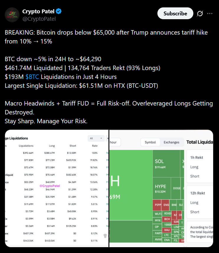 The latest drop followed President Trump’s announcement of a tariff hike from 10% to 15%, which triggered a wave of liquidations. In 24 hours, roughly $461 million in positions were wiped out, with heavily leveraged longs taking the brunt of the damage. Risk appetite has clearly cooled, and Bitcoin is reacting like a macro asset, not a detached hedge.