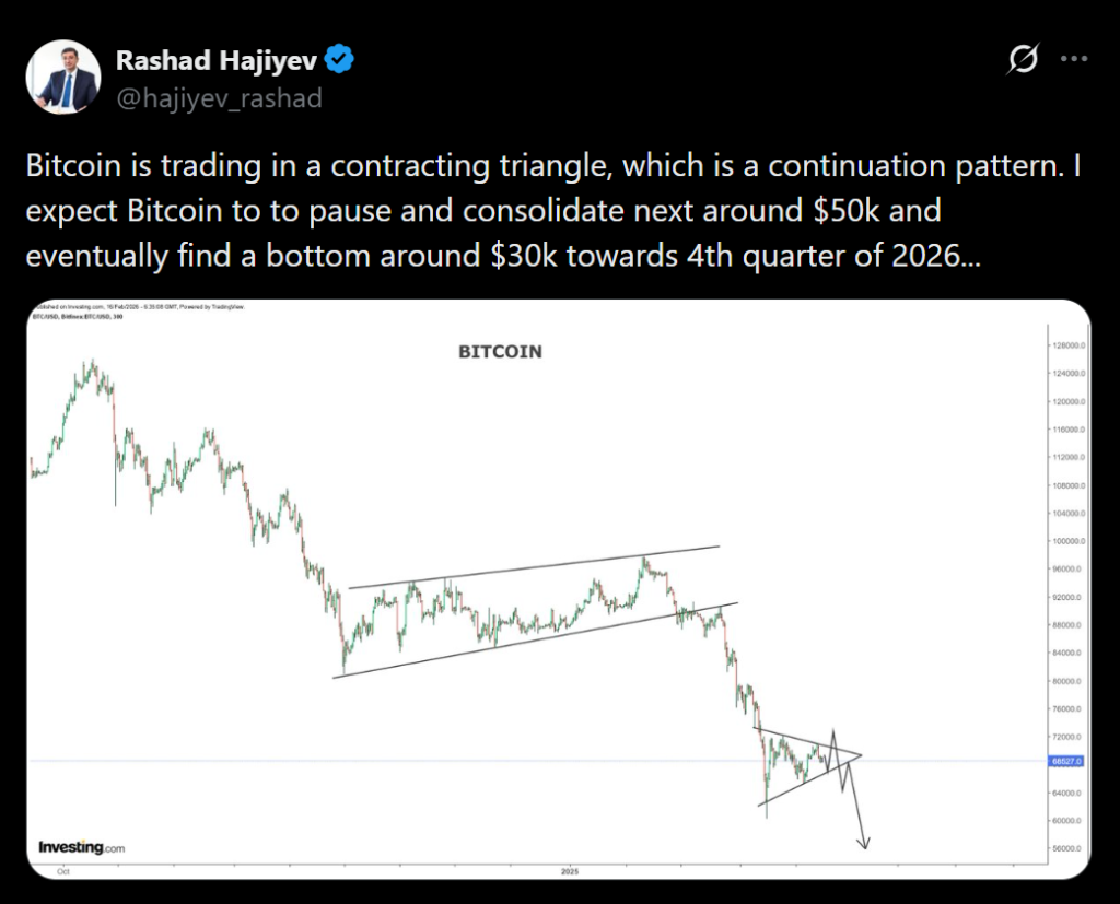 Some analysts argue BTC is forming a contracting triangle, typically viewed as a continuation pattern. Financial expert Rashad Hajiyev suggests Bitcoin could consolidate near $50,000 before potentially finding a deeper bottom around $30,000 into late 2026. That outlook reflects how cautious sentiment has become.