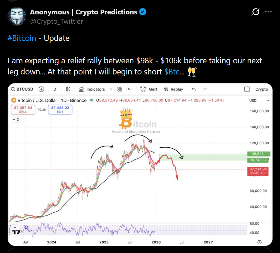 From a technical standpoint, expectations are also shifting upward. Crypto analyst Anonymous noted that while Bitcoin had been forming a head-and-shoulders pattern late in 2025, the structure now points toward a relief rally rather than immediate downside. His projected range places Bitcoin gradually moving between $96,000 and $106,000 over time. Even conservative interpretations suggest Bitcoin is building strength through consolidation, not exhaustion, as geopolitical uncertainty continues to support demand.