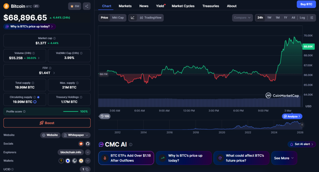 Just days earlier, Bitcoin had dropped to roughly $63,000 after reports of US-Israeli military action against Iran rattled risk sentiment. But by Sunday, momentum shifted. Following confirmation of Iran’s supreme leader’s death, Bitcoin rebounded past $67,000 before accelerating again. At last check, BTC was trading near $69,200, holding firm after a volatile weekend.
