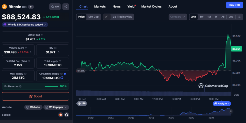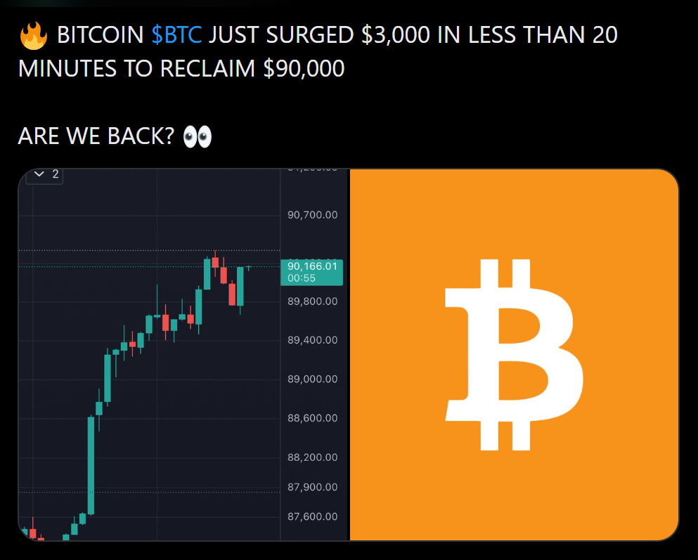 Crypto prices caught traders off guard on Wednesday, spiking higher just after U.S. equities opened for the day. Bitcoin surged back above the $90,000 level for the first time since last weekend, defying the recent pattern of selloffs during the U.S. market session. The move stood out not because of its size alone, but because of its timing, when many had braced for another drawdown.