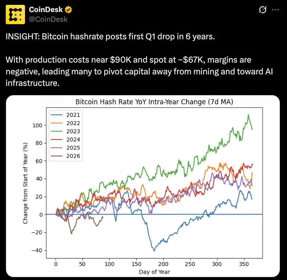Bitcoin has gone through cycles like this before. What’s different now is the presence of a stronger alternative, AI, pulling resources away at the same time.