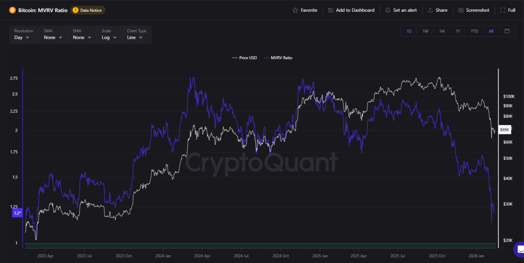 According to CryptoQuant data, Bitcoin is nearing what many analysts consider undervalued territory. BTC’s MVRV (Market Value to Realized Value) ratio is currently sitting around 1.2. In simple terms, MVRV compares Bitcoin’s current market value to the average price at which coins last moved onchain. When it drops below 1, it typically means the average holder is holding at a loss, and historically that has lined up with deep bear-market zones.
