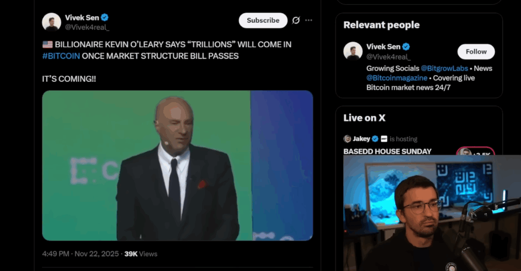 Tony spent time stressing the importance of the upcoming U.S. crypto market structure bill. The proposal could officially classify digital commodities under CFTC oversight. Kevin O’Leary has been vocal about this, saying once the classification is clear, “a trillion dollars will come and index Bitcoin.”