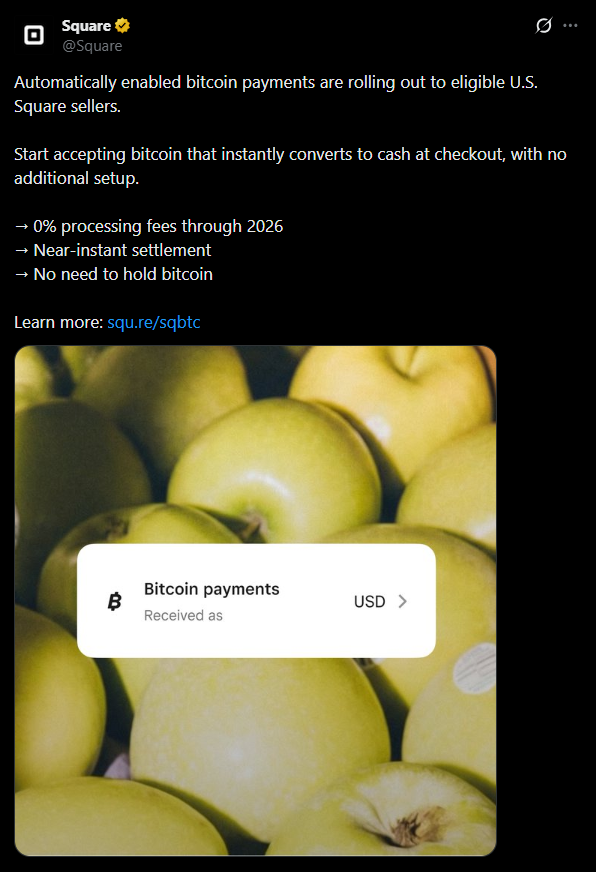 Square is also removing another major barrier, cost. Processing fees for Bitcoin payments are being waived through 2026, making it cheaper than many traditional card networks. That alone creates a strong incentive for businesses to lean into the feature.