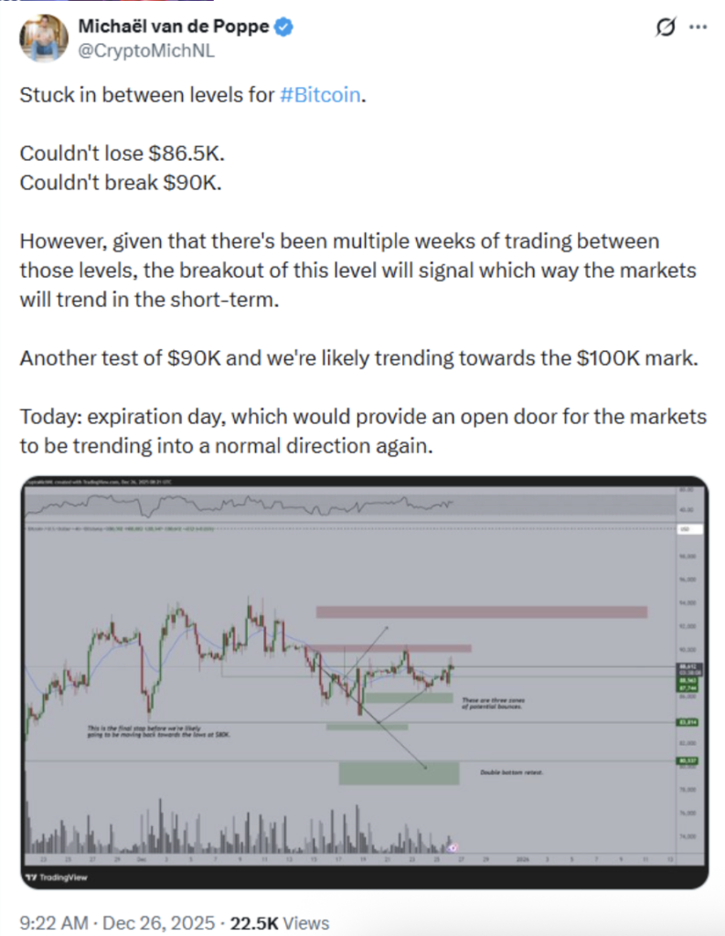 According to analyst Michaël van de Poppe, Bitcoin has repeatedly defended the $86,500 area while failing to push cleanly above $90,000. This range has survived multiple weekly closes, which is notable.