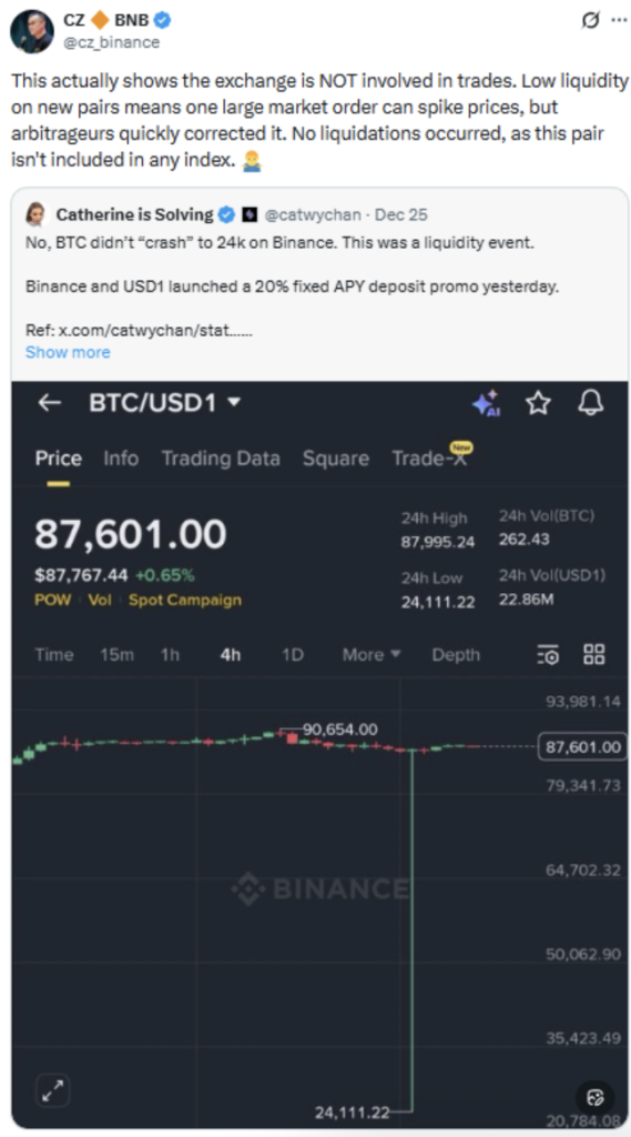 • A brief Binance flash crash was caused by thin liquidity in a niche trading pair, not by systemic market stress or liquidations.