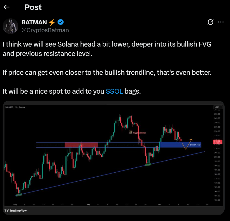 Batman noted that Solana could “dip slightly deeper into its FVG” before continuing upward — a move that may offer strategic entry points for traders. If momentum persists, SOL could rally toward $240–$250, aligning with prior resistance levels. Increasing trading volume and strong on-chain activity further underscore Solana’s position as one of the most technically sound altcoins in the current market.