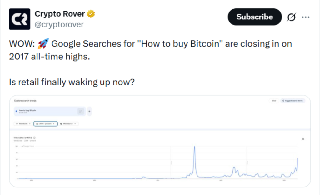 Online searches for the phrase “How to buy Bitcoin” are rising quickly, approaching levels last seen during the historic 2017 crypto bull run. The trend, initially highlighted by Crypto Rover and later reviewed by other market observers, has begun circulating widely across trading communities. That alone says something. When search data starts trending, narratives follow.