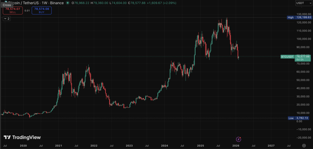 Bitcoin has dropped nearly 40% from its peak near $126,000, a move that has rattled confidence across the market. While price is still holding slightly above $77,000, the structure looks fragile, and many investors are bracing for the possibility of a deeper drawdown. Sentiment, for now, is clearly leaning bearish.