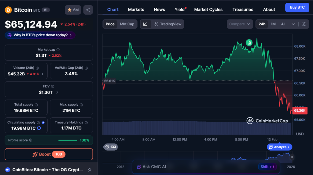 Bitcoin slipped 2% on Thursday, sliding toward the $66,000 level by midday and weighing on the broader crypto market. Ethereum hovered near $1,900, Solana fell to around $78, and XRP dipped to $1.35. The overall market tone was cautious, with more red than green across major assets.