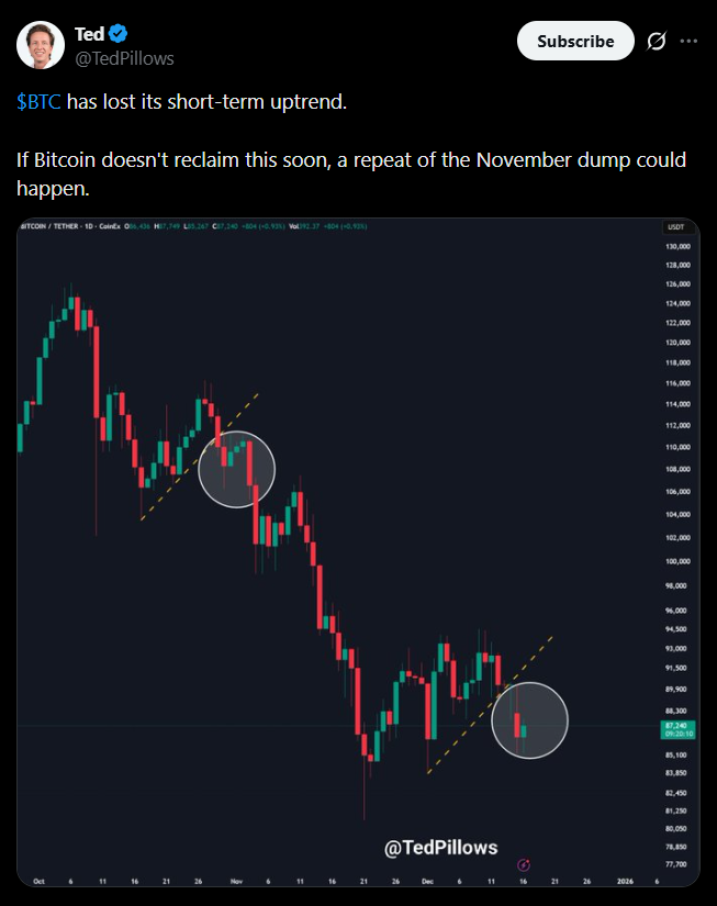 Despite the rebound, some analysts remain cautious about Bitcoin’s near-term outlook. Samer Hasn, senior market analyst at XS.com, described the recent move from November’s $80,000 low to early December highs as a corrective rally rather than a true trend reversal. He warned that the current environment remains fragile, especially after $750 million in long liquidations over the past two days, including $250 million tied to Bitcoin futures alone.