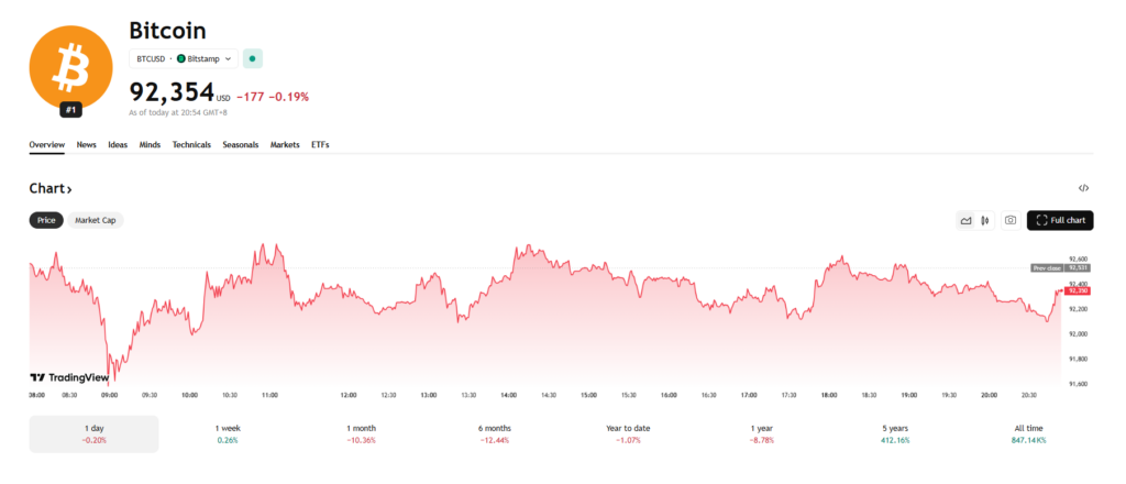 The Federal Reserve delivered its expected 25bps rate cut, but Bitcoin barely reacted, holding near $92,000 and continuing its unusually stagnant trading pattern. Even with supposedly “hawkish” guidance from the Fed, the U.S. dollar sold off sharply—yet BTC failed to capitalize. This lack of movement has frustrated traders who were expecting volatility, but the structure on the daily chart remains the same: a small rising channel inside a larger downtrend that has defined Bitcoin since its record highs.