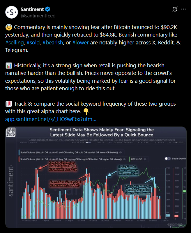 According to a recent Santiment report, market sentiment has slipped into a visibly anxious state. Bitcoin’s failure to hold above $90,000, followed by a quick retrace toward the mid-$80,000 range, has amplified bearish chatter online. Words like “selling,” “sold,” “bearish,” and “lower” are trending heavily across X, Reddit, and Telegram, reflecting a crowd leaning toward worst-case scenarios.