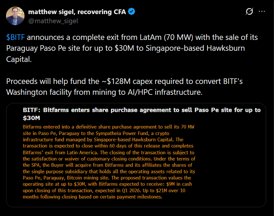 Bitfarms selling its Paraguay mining site sounds dramatic if you stop at the headline. An exit from Latin America. A tighter focus on North America. But when you zoom out, this looks less like a retreat and more like a disciplined capital decision. AI and high-performance computing are pulling in capital at a pace bitcoin mining can’t currently match. When an asset can be monetized today and recycled into infrastructure with denser returns and longer contracts, the math becomes hard to ignore.