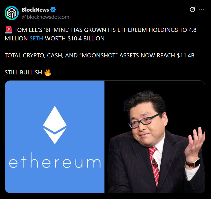 - Bitmine now holds 4.8M ETH, nearing 5% of total supply