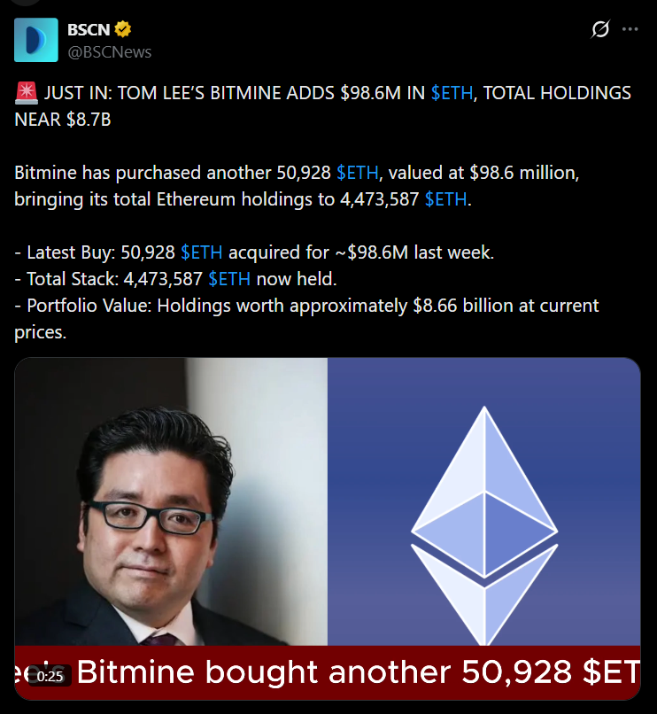 - BitMine bought 51,000 ETH, lifting holdings to 4.47 million coins