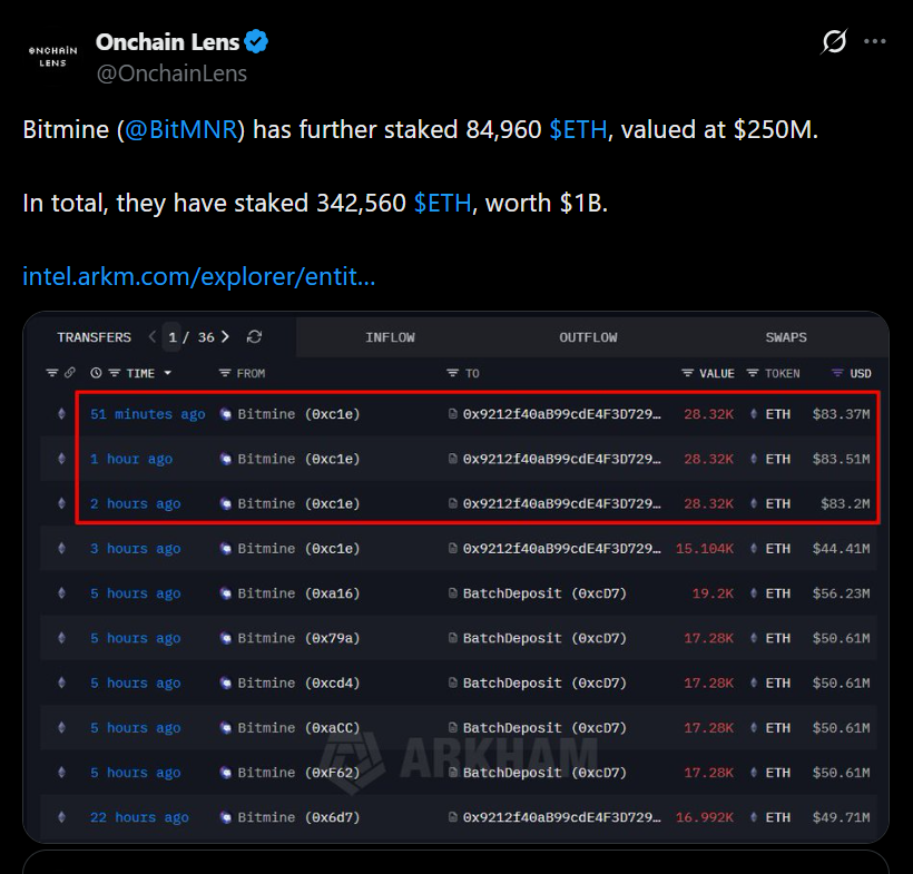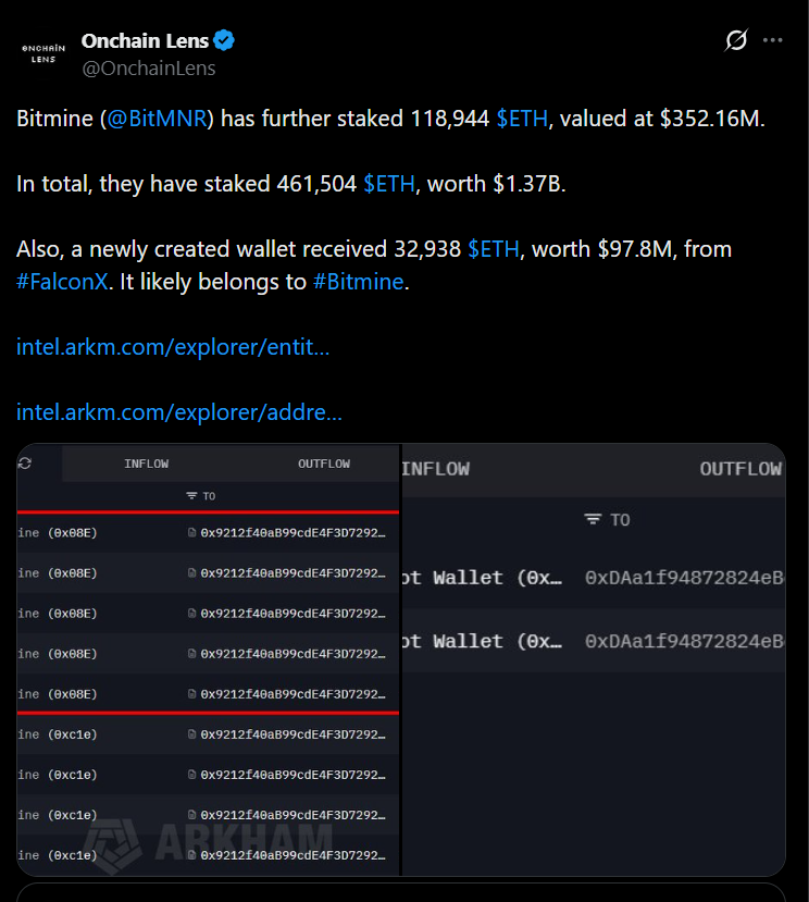 • Bitmine now has over 461,000 ETH staked, worth roughly $1.4 billion