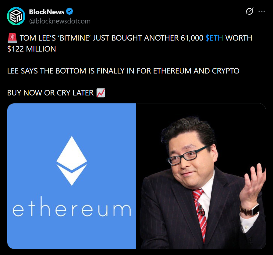 Chairman Tom Lee said the firm accelerated its accumulation strategy as crypto markets move through what he described as the later stages of a downturn. Despite ongoing geopolitical tensions and rising oil prices, Lee noted that Ethereum’s price has shown resilience.
